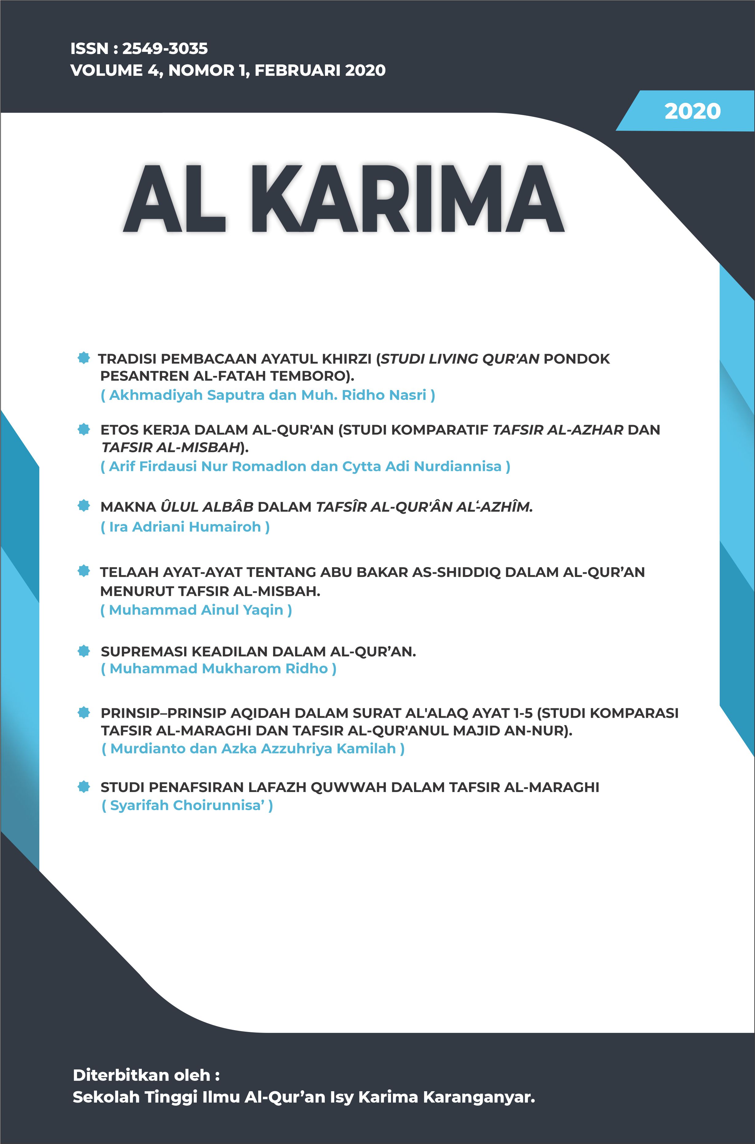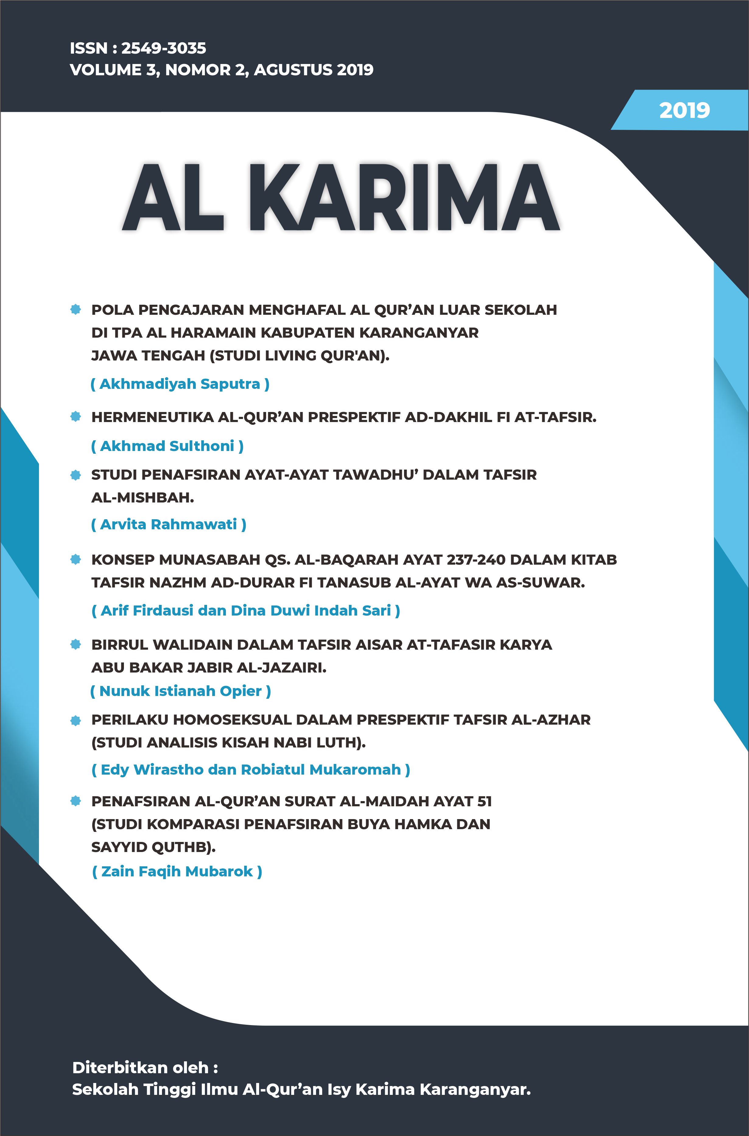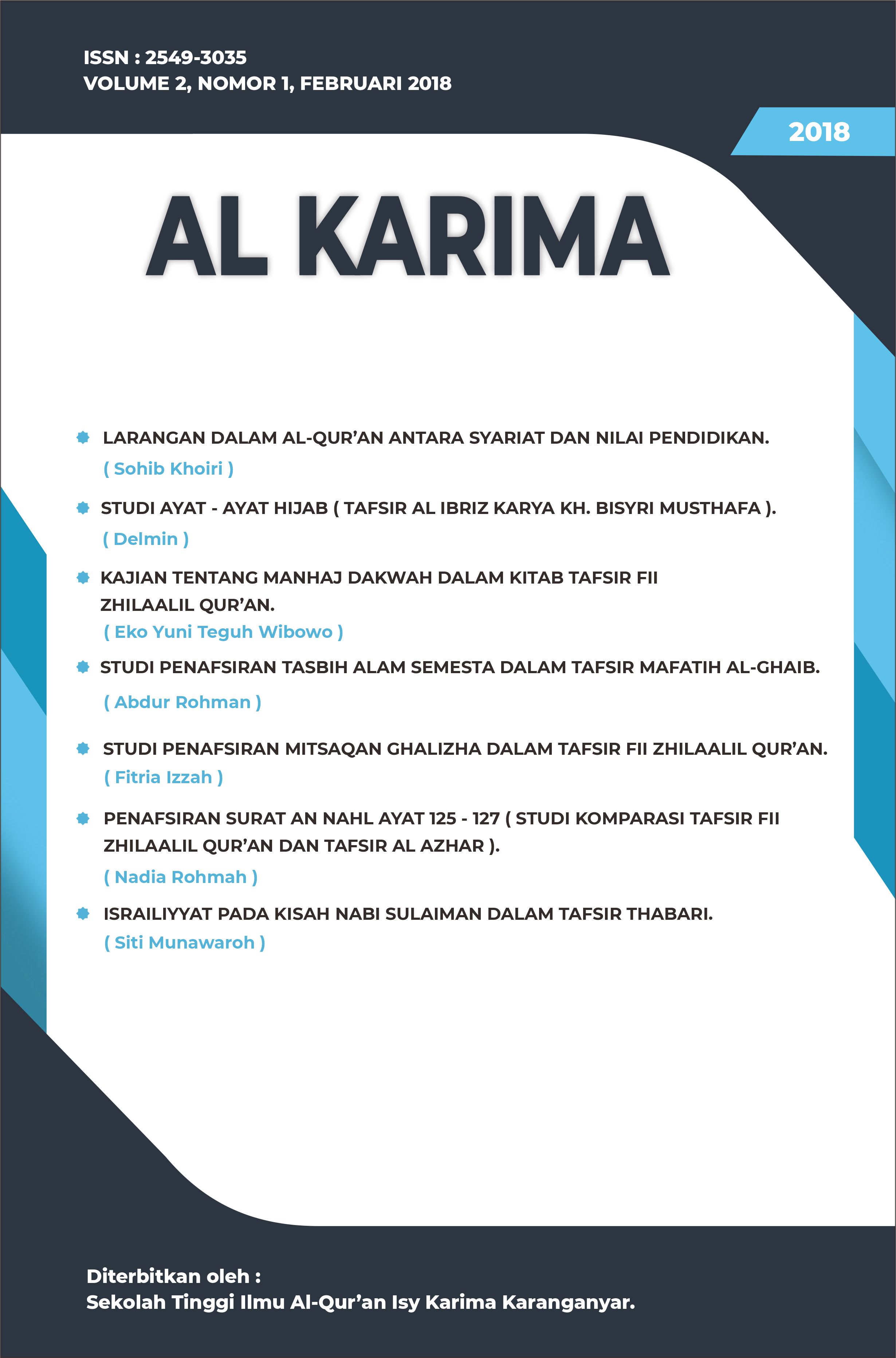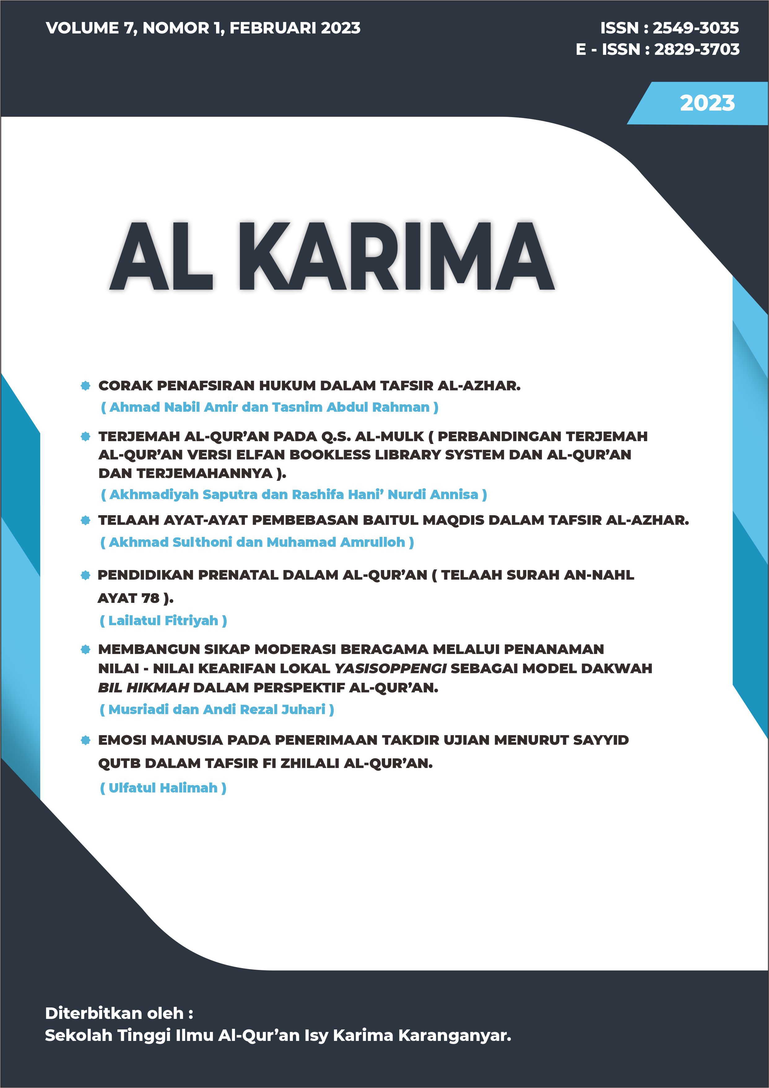 The Al Karima: Jurnal Studi Ilmu Al-Quran dan Tafsir (Vol. 7 No. 1, February 2023) includes 6 articles authored by scholars from Indonesia and Malaysia. The topics cover legal interpretations in Tafsir Al-Azhar, the translation of Surah Al-Mulk, the liberation of Baitul Maqdis, prenatal education in the Quran, fostering religious moderation through local wisdom, and emotional dimensions in Surah Al-Baqarah based on Sayyid Qutb’s interpretation.