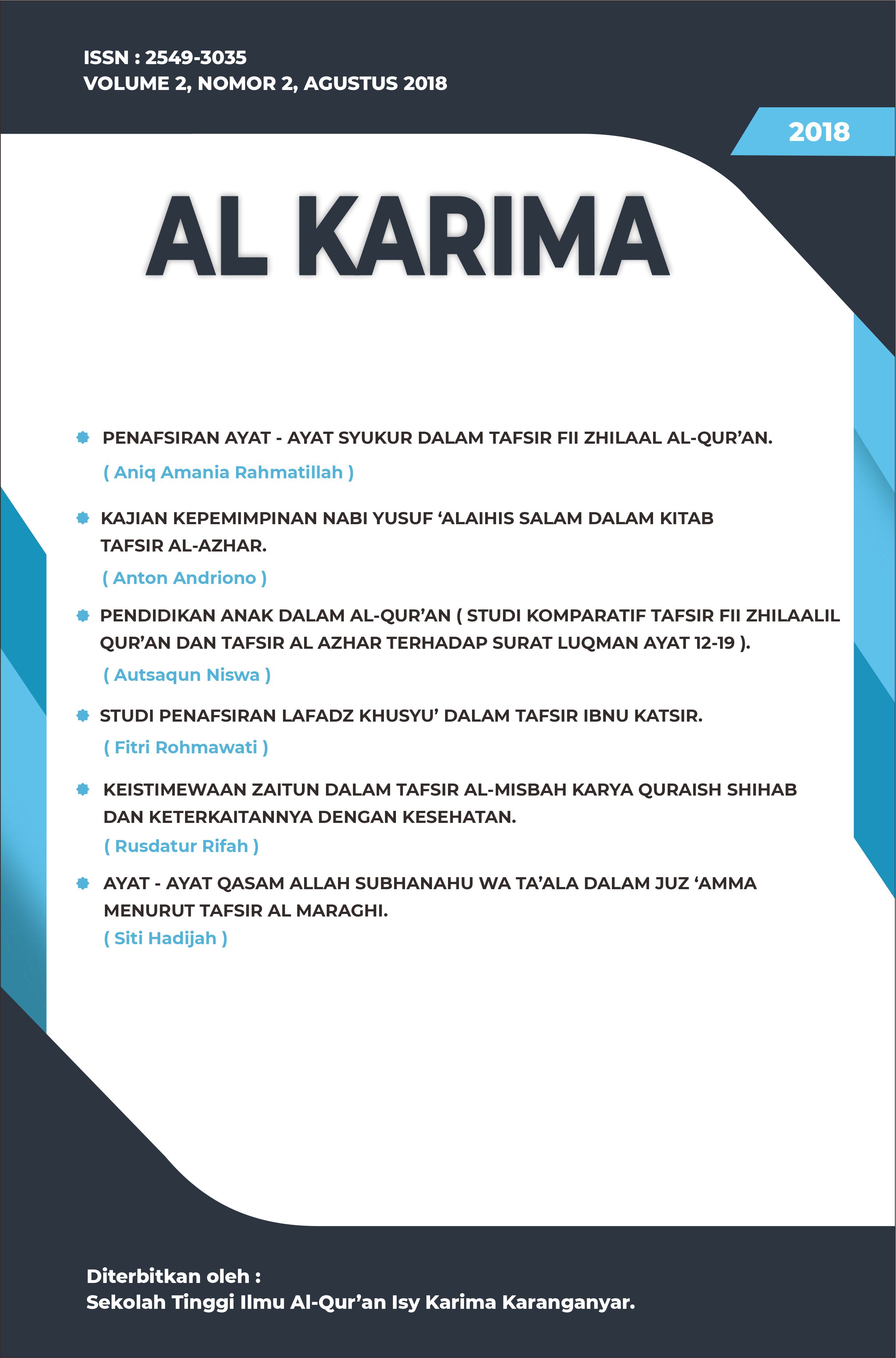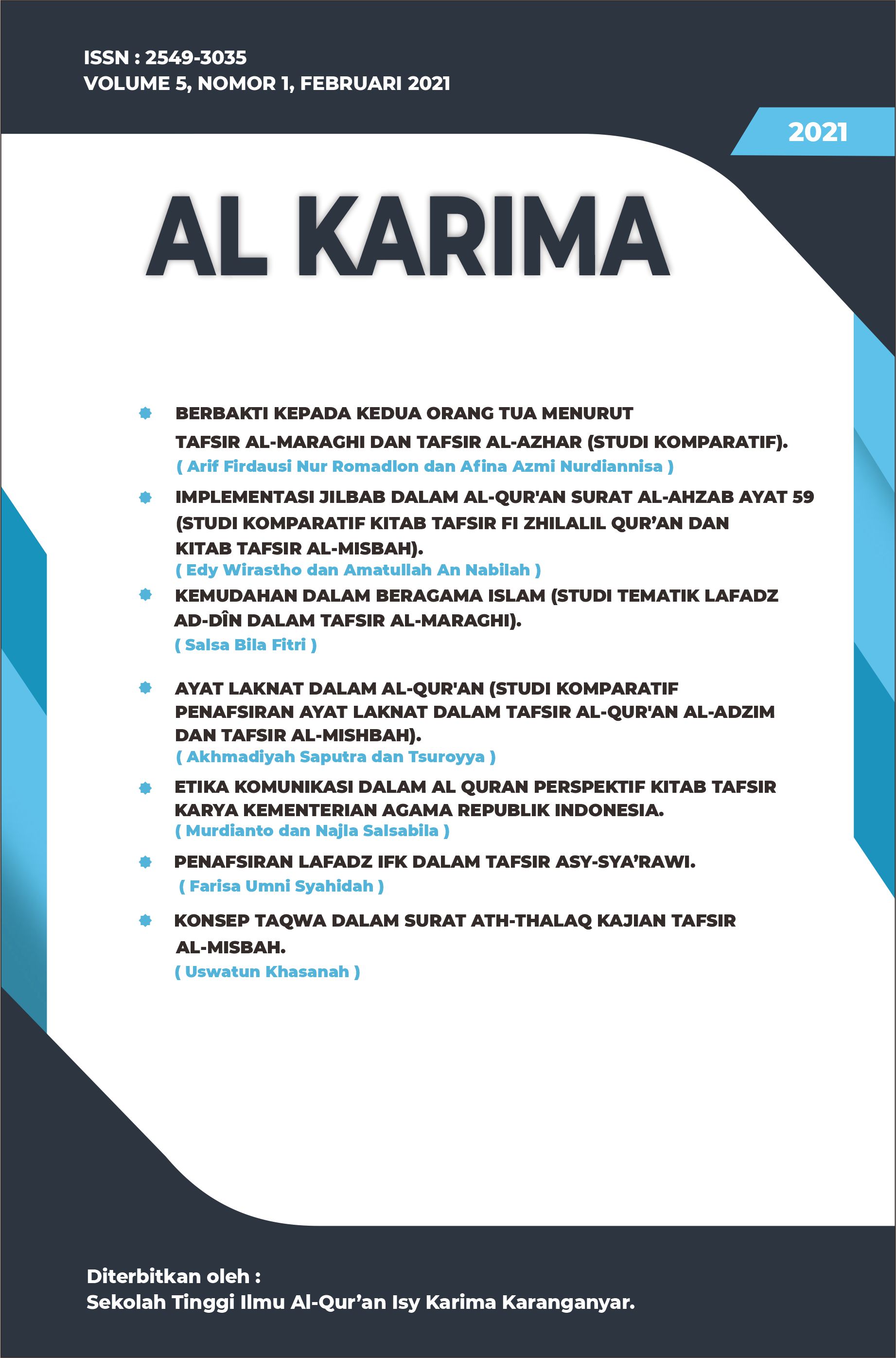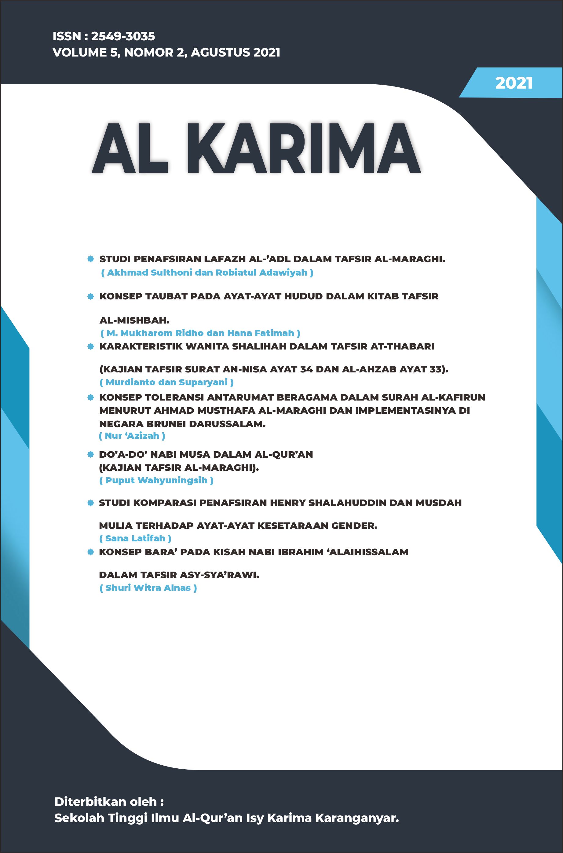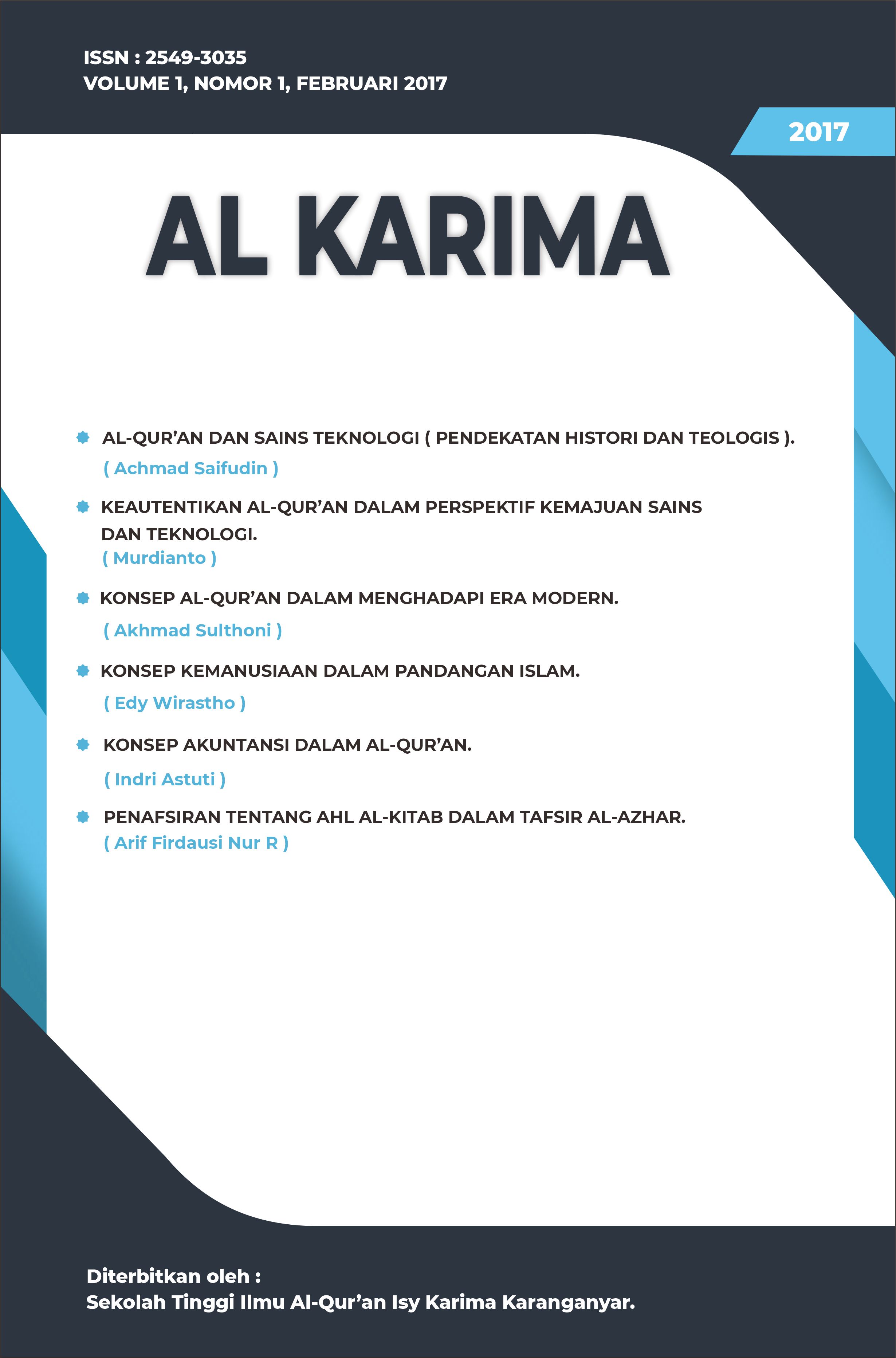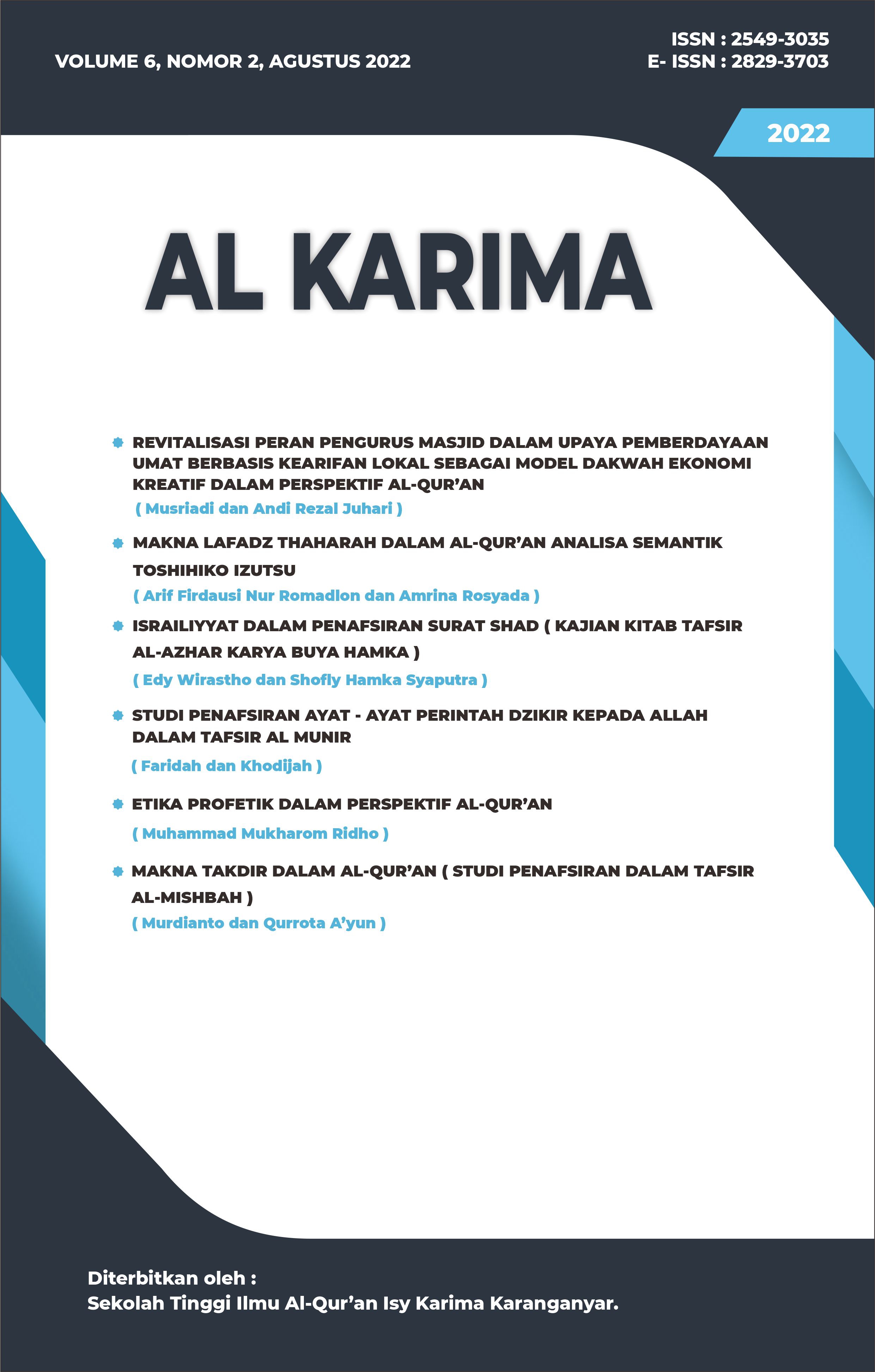 The Al Karima: Jurnal Studi Ilmu Al-Quran dan Tafsir (Vol. 7 No. 1, February 2023) includes 6 articles authored by scholars from Indonesia and Malaysia. The topics cover legal interpretations in Tafsir Al-Azhar, the translation of Surah Al-Mulk, the liberation of Baitul Maqdis, prenatal education in the Quran, fostering religious moderation through local wisdom, and emotional dimensions in Surah Al-Baqarah based on Sayyid Qutb’s interpretation.