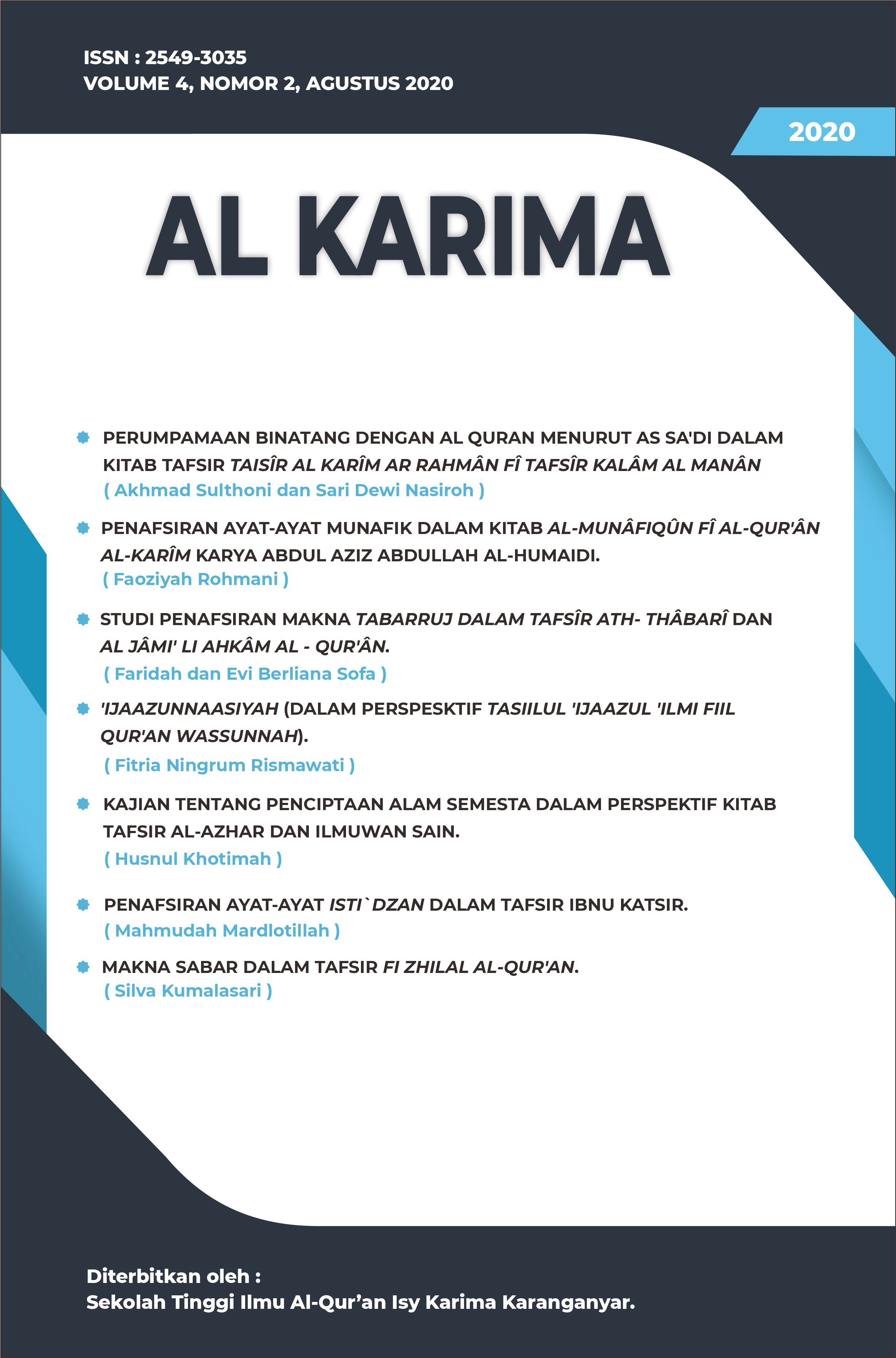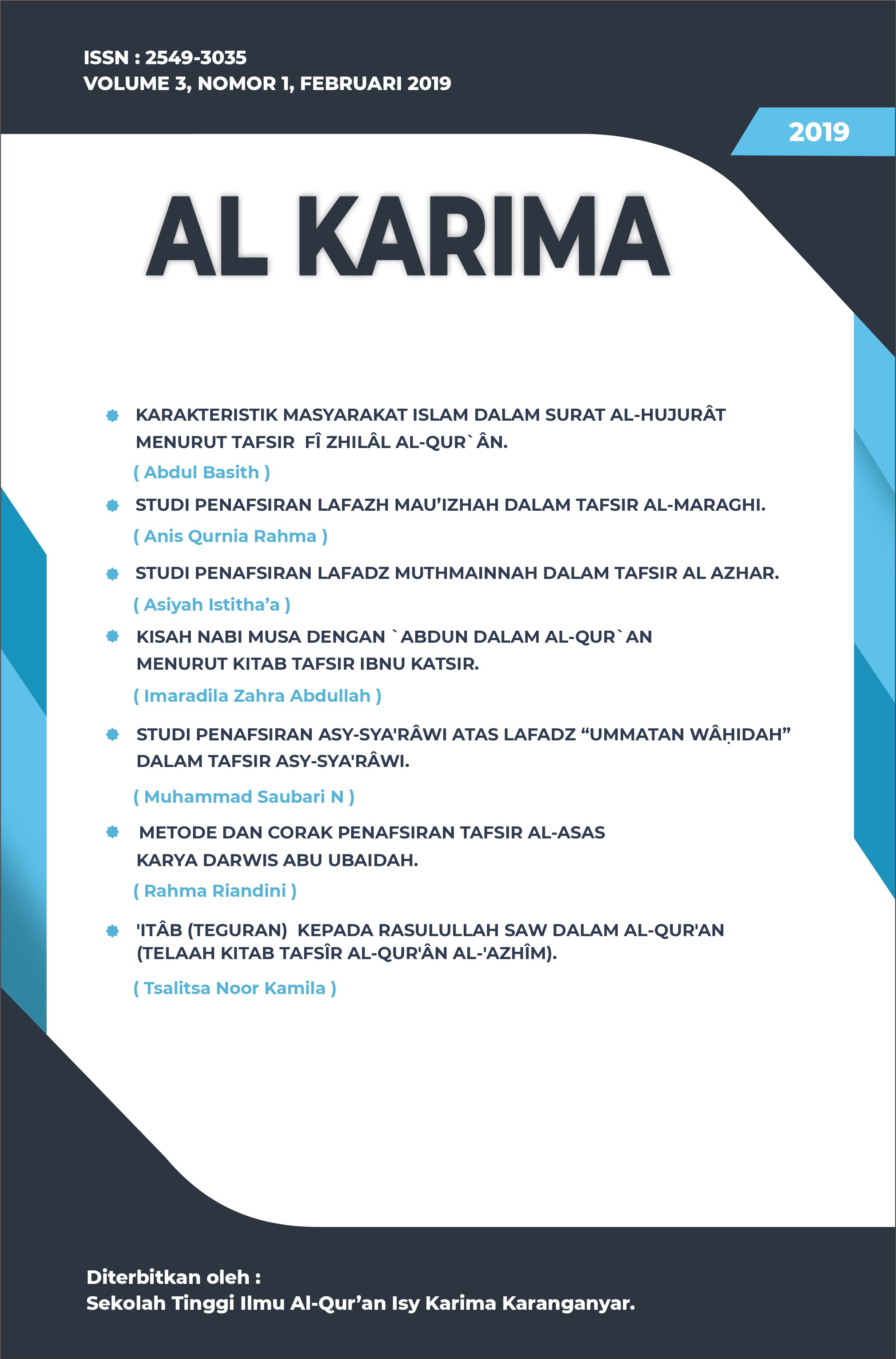 AL KARIMA is a biannual journal focused on the study of the science of the Quran and its interpretation. It is published by the Isy Karima Quranic Higher Education School in Karanganyar, Central Java, with issues released in February and August each year. The journal openly invites contributions of thoughtful insights and research findings from scholars and researchers in relevant academic disciplines.