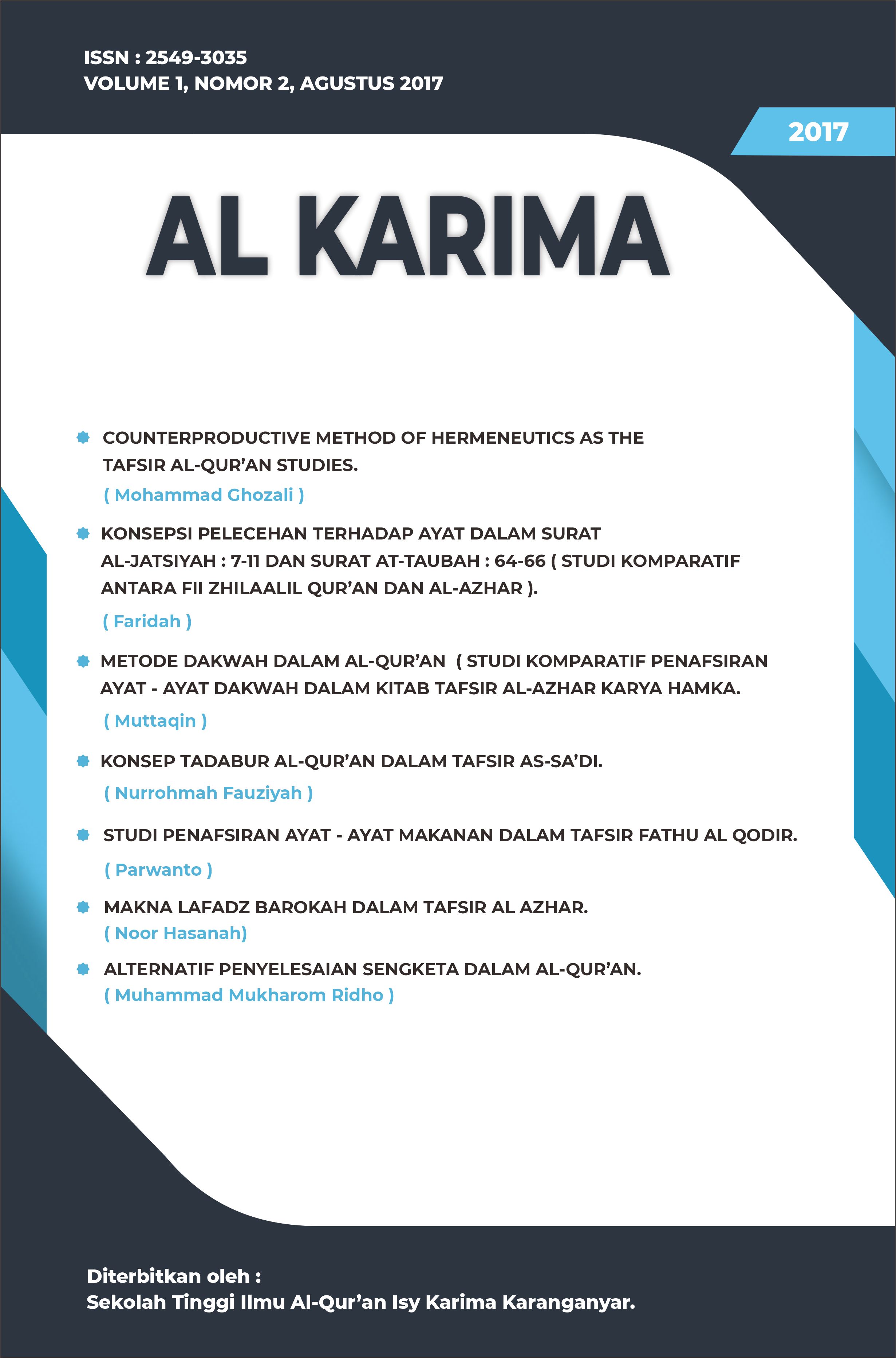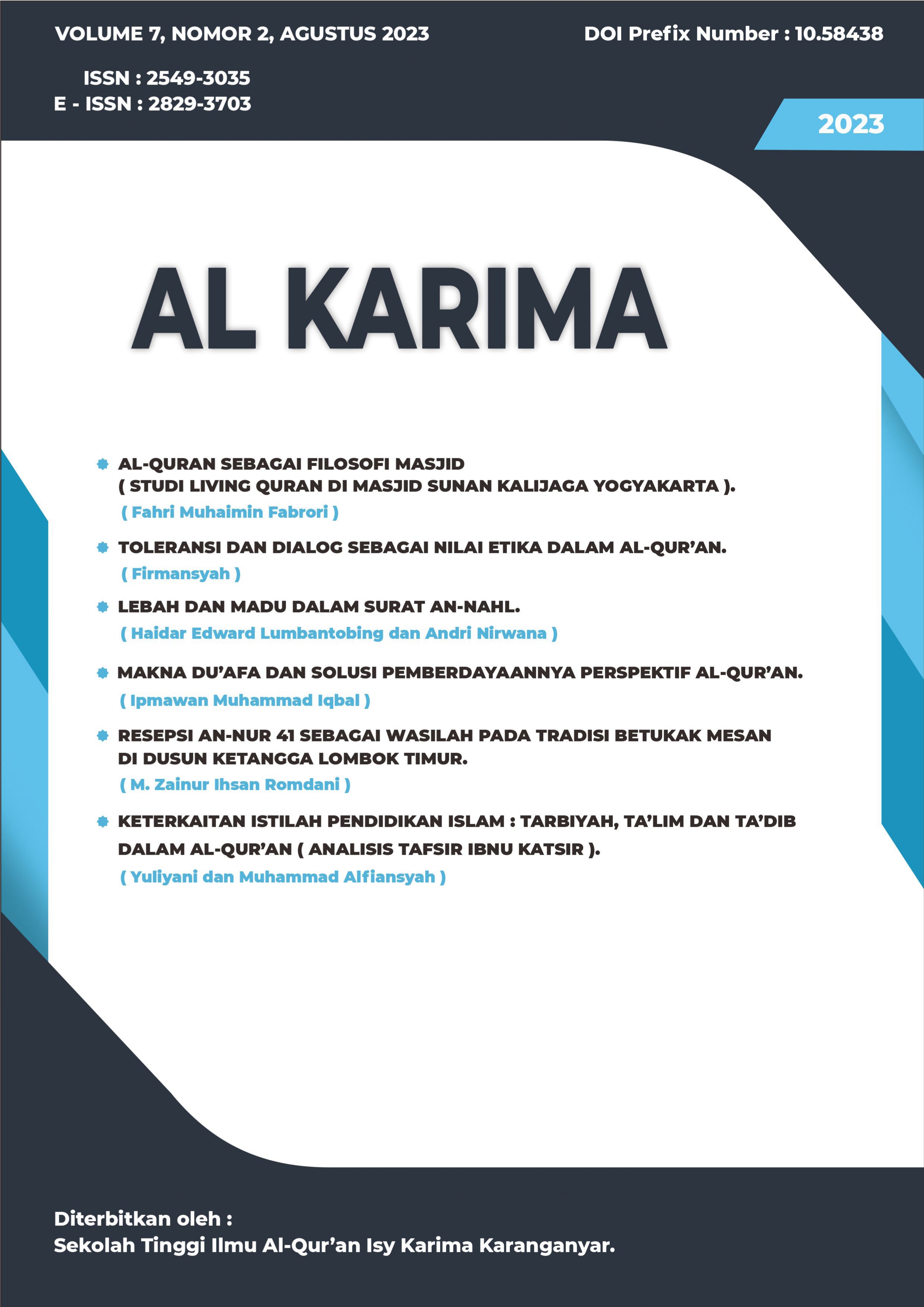 The Al Karima: Jurnal Studi Ilmu Al-Quran dan Tafsir (Vol. 7 No. 2, August 2023) presents 6 articles authored by scholars from Indonesia. The articles explore diverse topics including the symbolic significance of bees and honey in Surah An-Nahl, empowerment solutions for the weak as mentioned in the Quran, and the role of tolerance and dialogue in Quranic ethics.