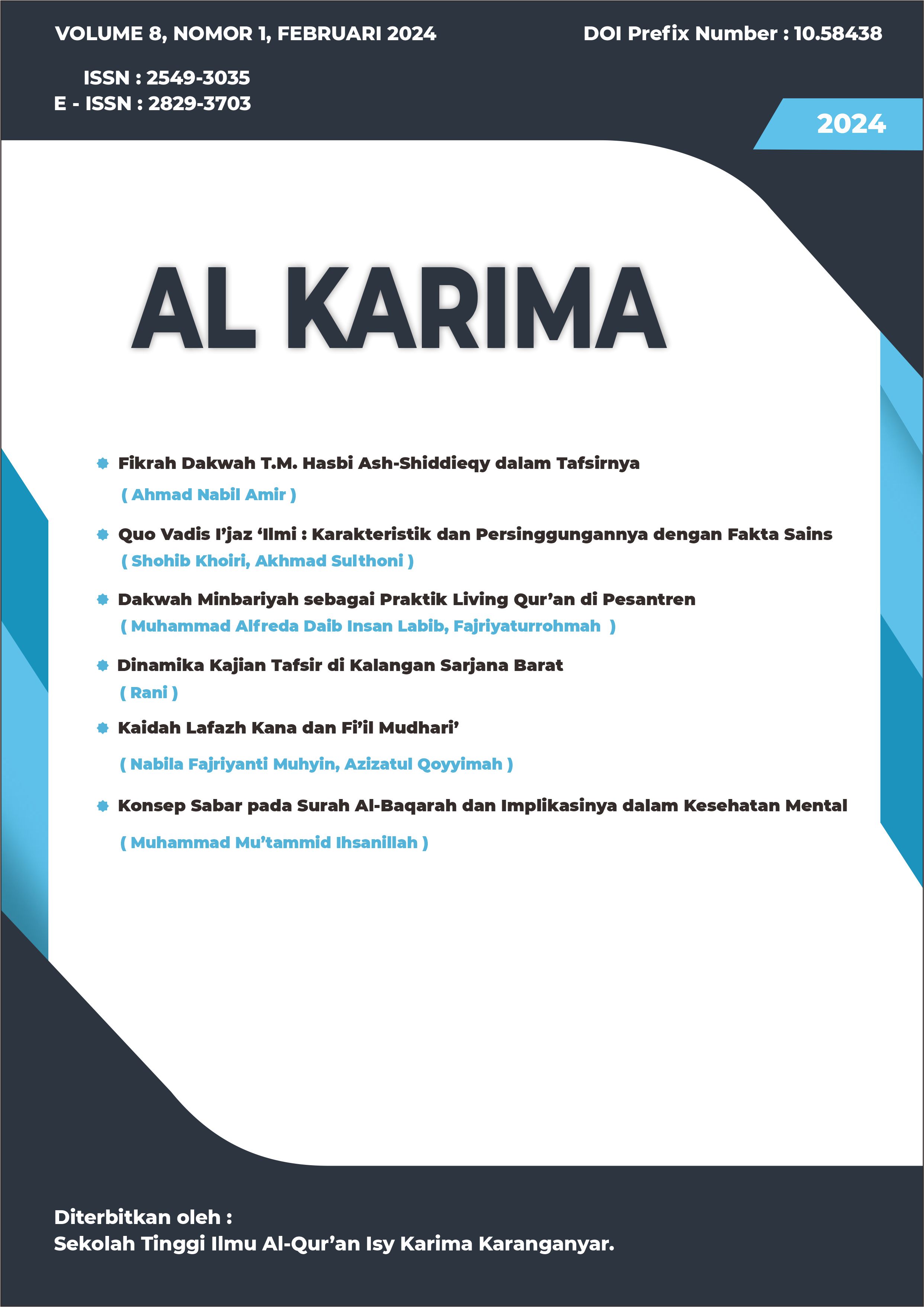 The Al Karima: Jurnal Studi Ilmu Al-Quran dan Tafsir (Vol. 8 No. 1, February 2024) features 6 articles authored by 10 scholars, focusing on Quranic studies and interpretation. Topics include T.M. Hasbi Ash-Shiddieqy's approach to Islamic preaching, the connection between I'jaz 'Ilmi (the miraculous nature of the Quran) and scientific findings, and the impact of patience in Surah Al-Baqarah on mental health. The authors represent academic contributions from Indonesia and Malaysia.