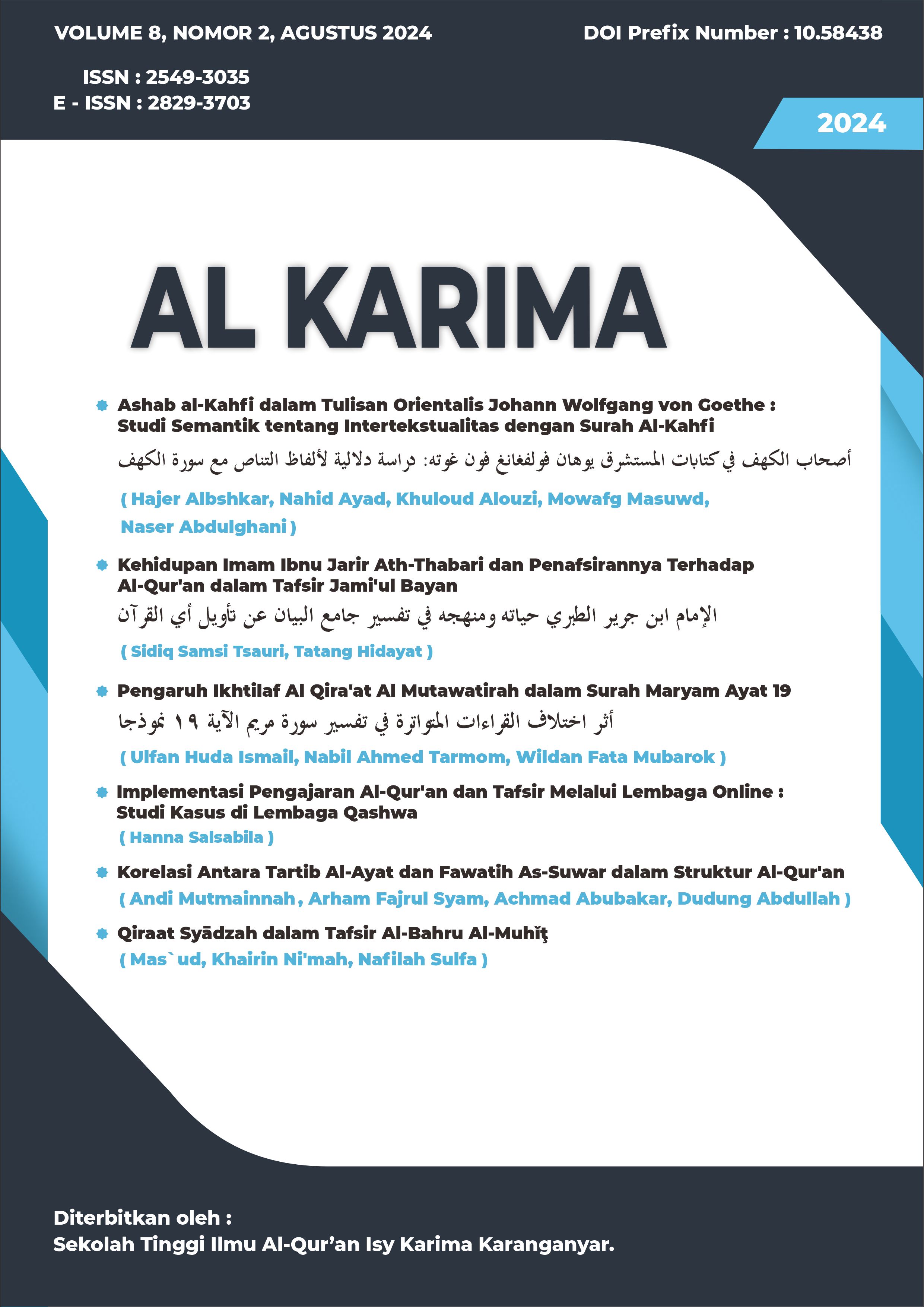 The Al Karima: Jurnal Studi Ilmu Al-Quran dan Tafsir (Vol. 8 No. 2, August 2024) includes 6 articles, with 3 in Arabic and 3 in Indonesian. The issue features 18 authors from various countries, including Libya, Egypt, and Indonesia, showcasing a wide range of perspectives on Quranic studies. Topics span from classical to modern interpretations, intertextual analyses, and the influence of Quranic exegesis on contemporary issues.